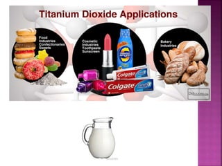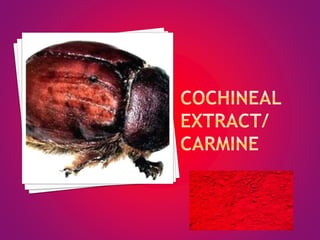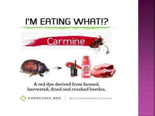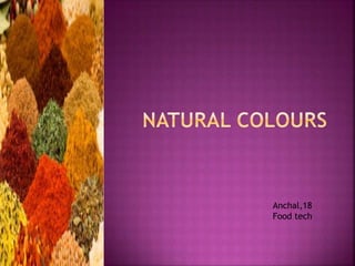 The document discusses food colorants and their sources. It describes that colors can come from natural pigments or added colorants. Natural pigments are extracted from animals, plants or minerals, while colorants are synthetically made dyes or lakes. Some examples of natural pigments discussed are caramel, cochineal extract, paprika oleoresin, riboflavin, titanium dioxide, and turmeric oleoresin. The stability and applications of these colorants are also summarized. The document concludes by comparing artificial colors, which are obtained through chemical reactions and may have health concerns, to natural colors which come from nature and have benefits but higher costs.