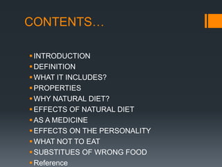 This document discusses the benefits of a natural diet, which consists of unprocessed, raw foods like vegetables, fruits, seeds, nuts, and water. Key points made include: