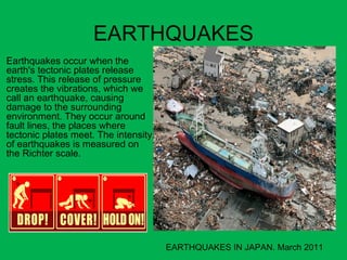 The document defines and describes several natural disasters including earthquakes, tsunamis, hurricanes, tornadoes, floods, typhoons, avalanches, thunderstorms, and landslides. Earthquakes occur along fault lines when tectonic plates release stress, tsunamis are large waves caused by underwater disturbances, and hurricanes are tropical storms over 74 mph that typically occur in summer and autumn in the Atlantic.