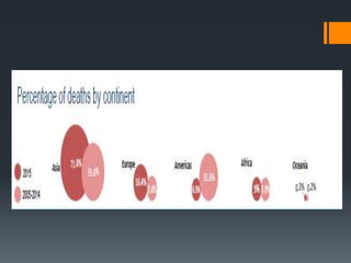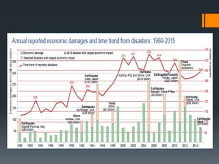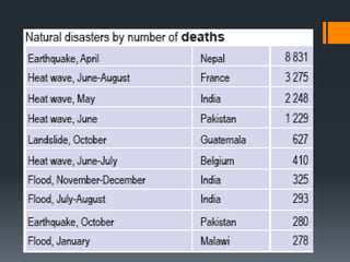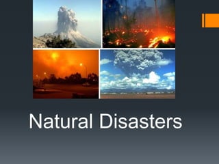This document discusses natural disasters and their effects. It defines natural disasters as natural events like floods, earthquakes or hurricanes that cause great damage or loss of life. It then lists some common types of natural disasters like earthquakes, floods, volcanoes and hurricanes. The document notes that natural disasters can severely injure or kill people and damage property, costing insurers $110 billion in 2009 and $218 billion in 2010. It provides examples of specific natural disasters like Japan's 2011 tsunami/earthquake that killed over 10,000 people and Hurricane Katrina, which caused $81 billion in property damage and displaced over 100,000 New Orleans residents. The document concludes by stating that while natural disasters cannot be prevented,