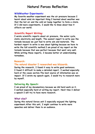 The student enjoyed learning about air pressure and how hot and cold air interact to form storms through weather experiments. They wrote scientific reports on various weather topics and found the report on tornadoes easiest while the report on lightning was most difficult. For a research project on blizzards, the student found it easy to write sentences but difficult to make a detailed report, working especially hard on the causes section. The student is proud of the documentary and speech they created, and aims to do more research and deliver additional speeches in the future.