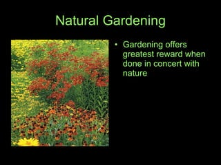 The document discusses the benefits of using native plants in home landscaping, emphasizing their relationship with local ecosystems and the importance of mimicking natural environments. It covers historical perspectives on gardening with native flora, the impact of non-native species, and the ecological advantages of native plants in promoting biodiversity and reducing maintenance costs. Additionally, it provides practical guidance for incorporating natives into home gardens while considering environmental factors and personal preferences.