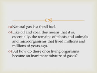 Natural gas is formed from the remains of ancient plants and animals. Over millions of years, organic matter buried underground is compressed and heated by deep sediments, transforming it into fossil fuels like oil and natural gas. This process, called thermogenic methane formation, breaks carbon bonds and produces more natural gas at higher temperatures over 1-2 miles below the surface. Alternative biogenic methane formation occurs near the surface as microbes break down organic matter, though this gas often escapes unless trapped underground.