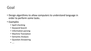 This document discusses natural language processing (NLP) and provides an overview of common NLP techniques. It describes the goal of NLP as allowing computers to understand human language to perform tasks like spell checking, search, translation, and question answering. The main approaches are rule-based methods, probabilistic modeling and machine learning, and deep learning. Text preprocessing steps like vectorization, normalization, and tokenization are explained. Methods for representing words like one-hot vectors and word embeddings are also covered, along with recurrent neural networks, LSTMs, GRUs, attention mechanisms, and transformer architectures.