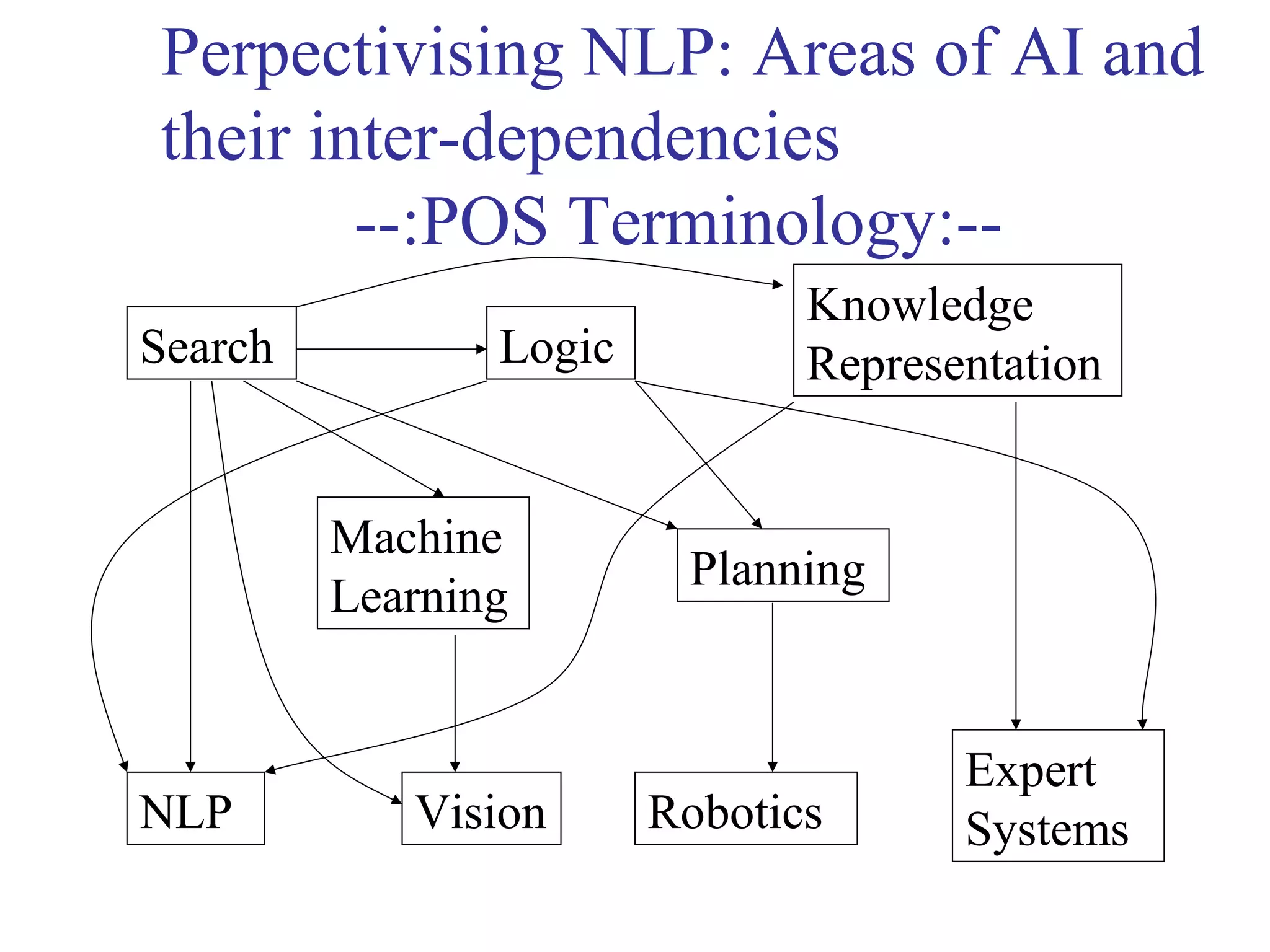 The document provides an overview of natural language processing (NLP) and its related areas. It discusses the classical view of NLP involving stages of processing like syntax, semantics, pragmatics, etc. It also discusses the statistical/machine learning view of NLP, where NLP tasks are framed as classification problems and cues from language help reduce uncertainty. Finally, it provides examples of lower-level NLP tasks like part-of-speech tagging that can be viewed as sequence labeling problems.