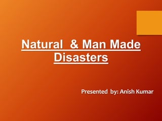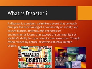 Natural disasters are sudden events, like earthquakes, volcanic eruptions, cyclones, floods, droughts and tsunamis that disrupt society. Man-made disasters result from human causes, intentionally or unintentionally, like nuclear accidents, chemical spills, radiological events, terrorism and more. Understanding the causes of disasters can help mitigate their effects, though not all can be prevented. Proper preparation and response are needed to reduce risks to lives and property.