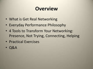 The document provides 4 tools for networking comfortably and effectively: presence, not trying to look good, focusing on connecting with others, and helping others. It discusses how networking is often an "unconscious performance" where people try to make a good impression but feel fake. The tools encourage being fully present, stopping efforts to appear a certain way, listening to the other person, and finding ways to be of service rather than focusing on personal goals. The overall message is to relax and connect with others rather than see networking as a performance.