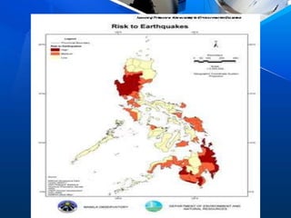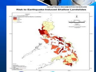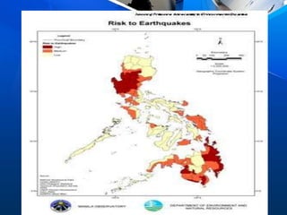 This document discusses various natural hazards in the Philippines caused by geological, hydro-meteorological and coastal processes. It provides details on seismic, volcanic and landslide events, as well as tropical cyclones, flooding and coastal erosion. Specific data is given on the provinces most at risk from earthquakes, landslides, volcanic eruptions, tsunamis and other hazards based on historical patterns and vulnerability factors. Mitigation strategies used by government agencies to monitor and warn of these risks are also summarized.
