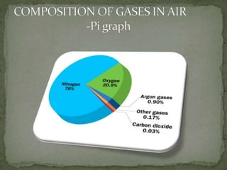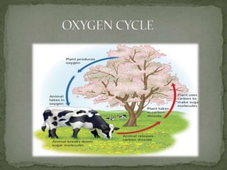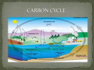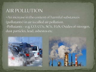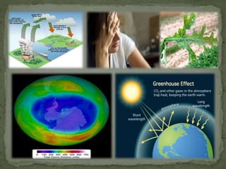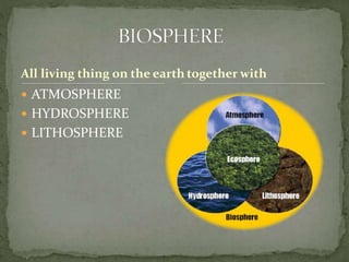 The document summarizes key components of Earth's biosphere. It describes the atmosphere, hydrosphere, and lithosphere and explains how they interact to support life. It also discusses various environmental issues like air pollution, water pollution, soil degradation, and their impacts on human health, plants, and aquatic life. Additionally, it provides a brief overview of different layers of the atmosphere and processes like greenhouse effect, ozone depletion, and carbon dioxide emissions that affect Earth's climate.