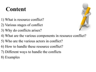 Resource conflicts arise from disputes over access to and control of natural resources due to incompatible interests, demographic changes, and poor governance. Key components include misunderstanding between parties, accusations, and inequity in resource distribution, with various actors such as local communities, NGOs, and government bodies involved. Effective conflict management strategies include negotiation, mediation, and use of legal systems, while examples of such conflicts can be seen in water resources, land issues, and illegal forestry activities.