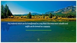 Forest resources are an important source of commercial products, food and shelter for tribal communities. They also play a key ecological role in regulating climate, soil conservation and biodiversity. However, deforestation due to agricultural expansion, livestock grazing, and illegal logging threatens forests and has severe environmental consequences like increased flooding and drought. Mineral resources are essential for development but overexploitation can lead to problems like species extinction, pollution, and depletion of high-grade minerals. Meeting the food needs of a growing global population is challenging and issues like undernutrition and malnutrition persist in many areas.