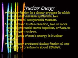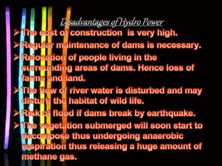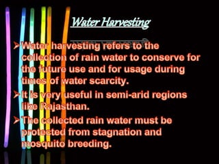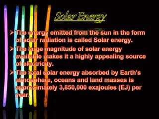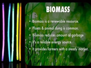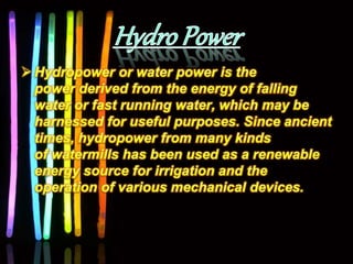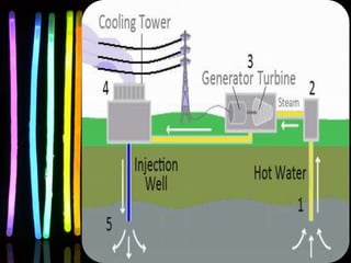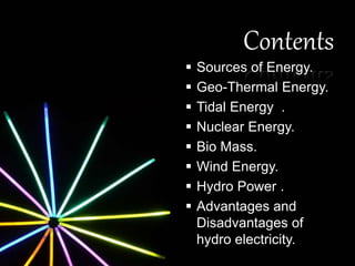 This document discusses various renewable and non-renewable energy sources. It covers geo-thermal energy, which uses heat from within the Earth's crust to generate electricity. Tidal energy and bio-mass energy are also mentioned. The document outlines sources of energy as either renewable sources like solar and hydro, or non-renewable sources such as coal. It also categorizes sources as conventional, which are used extensively, and non-conventional sources. Rain water harvesting is briefly discussed at the end.