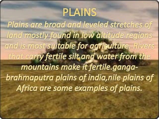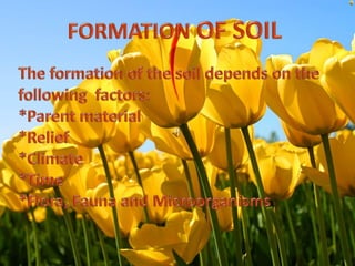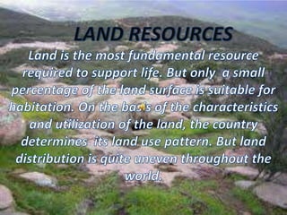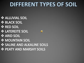 This document discusses different types of soils found in India and their characteristics. It describes alluvial soil, black soil, red soil, laterite soil, arid soil, mountain soil, saline/alkaline soil, peaty/marshy soil. It also discusses soil profile, factors influencing soil formation like parent material, relief, climate. It highlights issues like soil erosion and methods of soil conservation like contour ploughing, terrace cultivation, strip cropping, shelter belts. The document also provides an overview of water resources in India and challenges like scarcity as well as conservation methods like rainwater harvesting, sprinkler irrigation, afforestation, mulching, treating industrial effluent.
