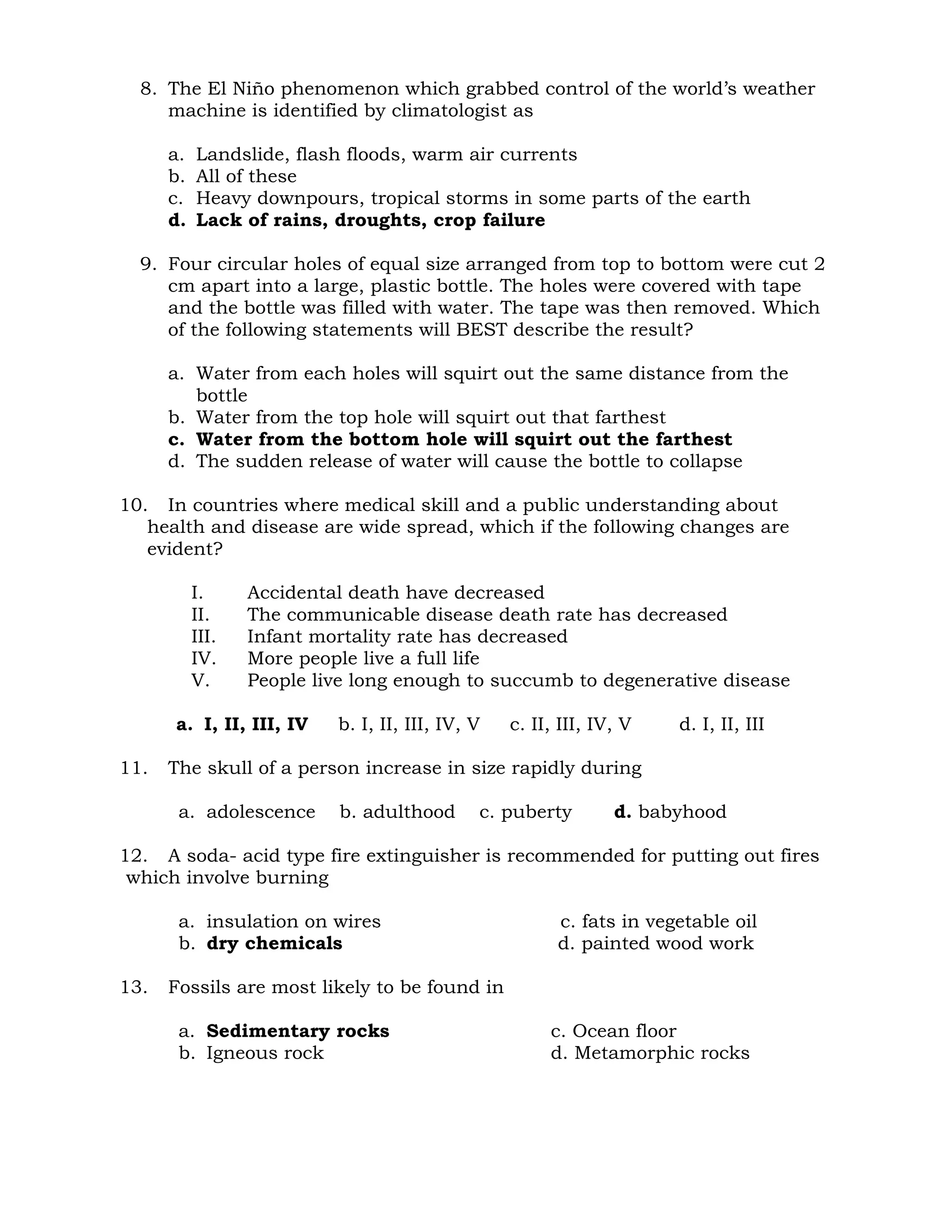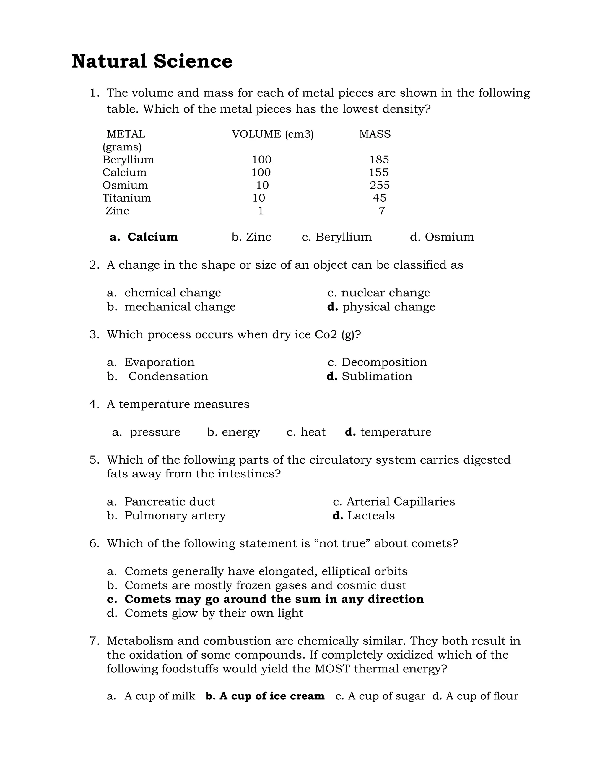 The document appears to contain multiple choice questions from natural science and social science subjects. It includes questions about density calculations, chemical and physical changes, human anatomy, astronomy, the scientific method, and Philippine history. The questions cover a wide range of science and social studies topics at varying levels of difficulty.