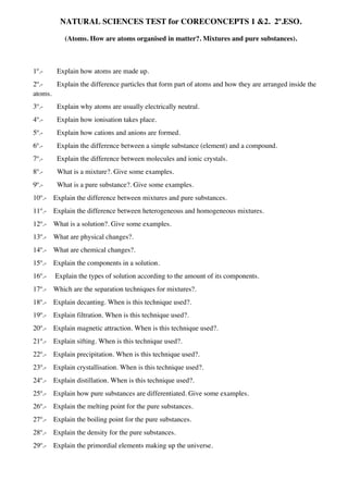 This document contains a natural sciences test covering core concepts about atoms, mixtures, and pure substances. It includes 29 questions about the structure of atoms, ion formation, distinguishing between elements and compounds, types of mixtures and solutions, separation techniques for mixtures like decanting and filtration, and properties used to identify pure substances such as melting point, boiling point, and density.