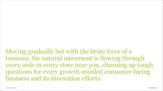 The document discusses the significant impact of the natural movement on consumer behavior and industry trends, noting its rapid growth and transformation of various markets. It emphasizes that businesses must adapt their strategies to capture the evolving consumer demand for natural products, which are increasingly preferred over traditional options. Moreover, companies face challenges in navigating this landscape without clear goals, as consumer trust shifts towards more authentic and transparent natural brands.