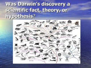 Darwin's discovery of natural selection is considered a scientific theory rather than a fact or hypothesis. A theory in science is an explanation or model supported by evidence from observation and experimentation. The Theory of Natural Selection proposes that species evolve over generations as favorable inherited traits become more common through the process of survival of the fittest. Darwin initially proposed natural selection as a hypothesis, or educated guess, but it is now accepted as a scientific theory that best explains how evolution by natural selection occurs.