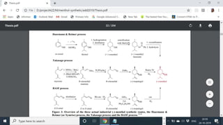 This document discusses natural and synthetic menthol production. Natural menthol is produced by extracting menthol crystals from mint essential oil. Synthetic menthol is produced via three main industrial processes: the Symrise process, Takasago process, and BASF process. While synthetic menthol production is more financially attractive due to stable supplies and reagents, the natural menthol market will only decrease if price differences narrow, which requires increased natural supply or decreased prices.