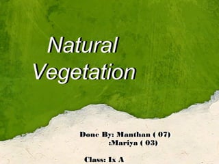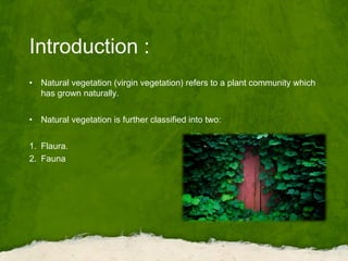 This document summarizes different types of natural vegetation found in India. It discusses flaura and fauna, and provides details on the number of plant and animal species in India. It then describes different types of forests found in India like tropical rainforests, tropical deciduous forests, tropical thorn forests and scrubs, montane forests, and mangrove forests. For each forest type, it lists example plant and animal species found there. It also discusses the importance of trees, wildlife preservation, and the economic value of wild plants and animals.