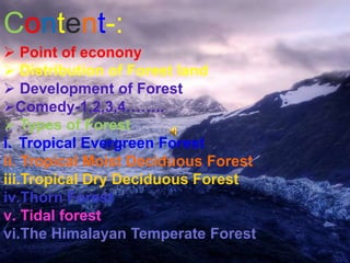 This document summarizes the different types of natural vegetation and forests found in India. It discusses six main types of forests - tropical evergreen, tropical moist deciduous, tropical dry deciduous, thorn forests, tidal forests, and Himalayan temperate forests - and their geographic distributions across India based on climate and terrain. It also provides statistics on India's total forest land coverage and the states with highest and lowest concentrations of forests. The document concludes by noting problems with forest degradation due to population growth and unsustainable practices, and the need for forest development efforts.