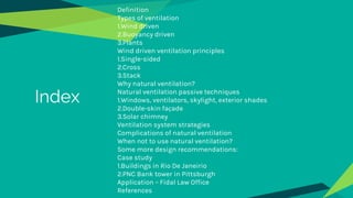 The document discusses natural ventilation, including definitions, types, principles, benefits, techniques, strategies, and case studies. It defines natural ventilation as air supply and removal through natural means without mechanical systems. The main types described are wind-driven, buoyancy-driven, and plant-based ventilation. Principles include single-sided, cross, and stack ventilation. Benefits are lower energy use, space efficiency, and increased occupant productivity. Techniques involve windows, double skin facades, and solar chimneys. Case studies illustrate successful natural ventilation in buildings in Rio de Janeiro and the PNC Bank Tower in Pittsburgh.