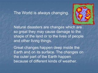 This document defines and provides examples of different types of natural disasters. It explains that natural disasters are major changes in the environment caused by weather or geological events that can damage land and threaten lives. The document then lists and briefly describes several specific natural disasters: volcanic eruptions caused by pressure below the Earth's surface; earthquakes from movement of tectonic plates; cyclones/hurricanes that bring high winds and flooding; avalanches that move snow and rock rapidly down mountains; floods from overflowing rivers and coastal flooding; droughts characterized by extended lack of rain; and forest/bush fires ignited by lightning or human carelessness.