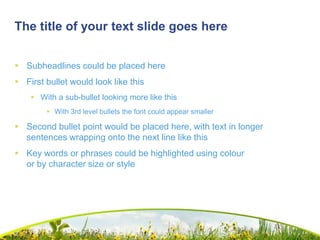 This presentation template includes placeholders for the title, presenter name and job position, and text slide title. It uses subheadings and bulleted lists, with the option of multiple nested levels of bullets, to structure topics. Stylistic elements like color, size, and style are suggested to highlight important words or phrases.