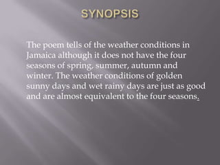 1. The poem describes the climate in Jamaica, noting that it does not experience distinct seasons like spring, summer, fall, and winter. Instead, it enjoys golden sunny days and rainy days that create weather almost like seasonal changes.