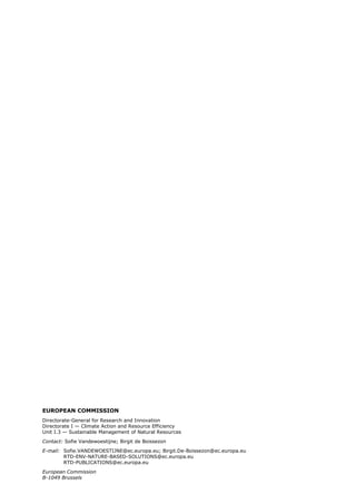 This document outlines key opportunity areas for an EU research and innovation policy agenda on nature-based solutions. It identifies four main goals: 1) enhancing sustainable urbanization, 2) restoring degraded ecosystems, 3) developing climate change adaptation and mitigation, and 4) improving risk management and resilience. For each goal, nature-based solutions could address environmental, social, and economic challenges in sustainable ways. Specifically, for sustainable urbanization, nature-based solutions support green economic development, environmental protection, and social well-being in cities facing increasing urbanization.