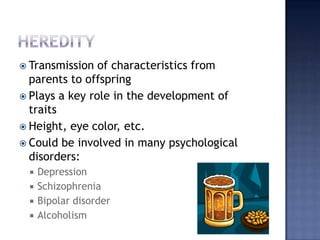 This document discusses the nature vs nurture debate regarding the development of traits in humans. It explains that heredity, through the transmission of genes from parents to offspring, plays a key role in determining traits like height and eye color. However, the impact of one's environment through factors like education and living conditions is also influential. Twin studies are often used to help understand the relative impact of nature vs nurture, by comparing identical twins who share all genes to fraternal twins who only share some. Questions remain about the influence of heredity and environment on traits like intelligence, personality and psychological disorders.