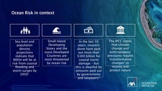 The document highlights the urgent need for transformative changes to combat climate change and ocean risk, particularly for vulnerable regions at risk of coastal flooding. It discusses barriers to private investment in natural capital, including a lack of understanding and inadequate policies, while emphasizing the role of research, innovation, and specialized finance products to promote investment in ocean resilience. Overall, it advocates for the development of projects and policies that enhance resilience and generate financial returns in the face of ocean-derived risks.