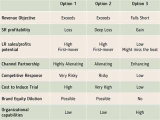 Natureview Farm is considering expanding their sales of yogurt from local stores into supermarkets. They analyze two options - option 1 focuses on selling in supermarkets while maintaining existing store sales, and option 2 focuses only on store sales. Natureview Farm ultimately pursues option 1, expanding into supermarkets, but faces challenges with distribution and shelf space that reduce profits below projections in the first year. They learn important lessons about distribution, shelf space, and promotion strategies in large supermarkets.