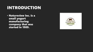 Natureview Inc. is a yogurt manufacturing company founded in 1989 in Vermont. By 1999, it had grown to $13 million in profits by focusing on flavored yogurt and developing strong relationships with natural food retailers. It introduced 12 new flavors and fruit-on-the-bottom yogurt. To reach $20 million by 2001, Natureview needs new financing and to decide whether to expand into supermarket channels or focus on natural food stores. It analyzes its strengths, weaknesses, opportunities, and threats. The case study presents Natureview's financial statements, sales projections, and three options proposed by its marketing team for growth.