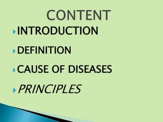 Naturopathy uses natural treatments to help the body heal itself without drugs or surgery. It treats diseases by removing waste from the body through fasting, hydrotherapy, and other natural methods. The key principles of naturopathy are that the body has an innate ability to heal itself, cures come from within the body rather than outside treatments, and diseases result from a buildup of waste in the body.