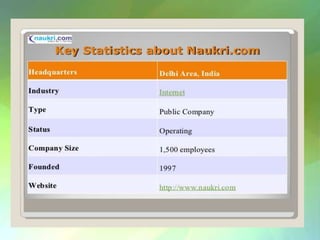Sanjeev Bikhchandani co-founded Info Edge (India) Ltd. in 1990 and served as its CEO until 2010. He established Naukri.com, India's largest job search website, in 1997. Naukri.com has over 150 million page views per month and 200,000 active job listings. It has strong brand recognition in India as the leading online job search platform and is known for its positive work culture. However, high employee attrition and lack of employer branding on the site pose challenges, and increasing internet usage and broadband access may allow new competitors to enter the market.