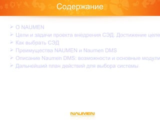 Документ содержит информацию о компании Naumen и ее системе управления бизнес-процессами Naumen DMS, которая автоматизирует электронный документооборот и архивное хранение. Представлены цели и задачи внедрения системы, преимущества Naumen DMS, а также критерии выбора системы электронного документооборота. Также описаны модули системы, подходы к внедрению и потенциальные отрасли применения.