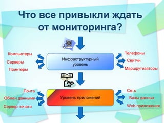 Документ описывает систему мониторинга, разработанную для решения бизнес-задач и повышения доступности критических сервисов. Основные преимущества включают визуальные инструменты для бизнес-аналитики, снижение трудозатрат и рисков, связанных с авариями. В процессе реализации используются технологии автоматического аудита, разработки ресурсно-сервисной модели и интеграции с нишевыми системами мониторинга.