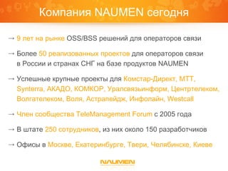 Компания Naumen является интегратором решений OSS/BSS для операторов связи, успешно реализовав более 50 проектов в России и СНГ за 9 лет. В штате компании находится 250 сотрудников, включая 150 разработчиков, а также предоставляются услуги консалтинга и обучения для повышения эффективности бизнес-процессов. Naumen активно участвует в международном сообществе TM Forum, разрабатывая и внедряя интеграции для оптимизации работы операторов связи.