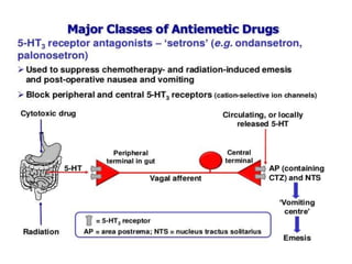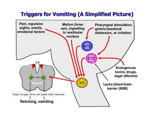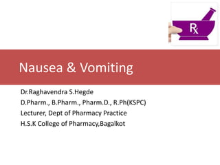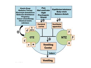 The document discusses nausea and vomiting, defining emetics as agents that induce vomiting primarily used in poisoning cases. It outlines the mechanisms and pathways involved in the vomiting process, highlighting the roles of the vomit center in the medulla oblongata and neurotransmitter receptors. It also emphasizes the management strategies for nausea and vomiting, including pharmacological and non-pharmacological treatments, and the critical role of pharmacists in monitoring and referring patients when necessary.