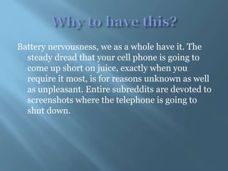 The document discusses wireless charging technology for smartphones. It explains that wireless charging works through electromagnetic induction between coils in the charging base and in the phone. When the phone is placed on the charging base, an alternating magnetic field is created between the coils, which transfers power through resonance to charge the phone battery without needing a wired connection. While convenient, wireless charging is less efficient than wired quick charging and can cause more heat generation in the phone. It is seen as a good option for occasional or emergency charging when a wire is not available.