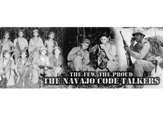 The document discusses the role of Navajo Code Talkers during World War II, highlighting their unique language and its use in military communication to enhance message transmission speed. Initiated by Philip Johnson, 29 Navajo soldiers were recruited to create a code that was never written down and proved to be significantly faster than existing methods. Although initially met with skepticism, their contributions played a crucial role in saving American lives and remain largely unrecognized.