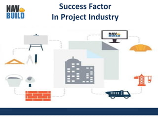 The document discusses key success factors in the project industry, emphasizing faster and accurate tendering, supply chain efficiency, and operational control. It highlights the importance of productivity and management in areas such as project accounting, subcontracting, and maintenance. Additionally, it mentions industry-ready templates for expedited deployment and lower total cost of ownership (TCO).