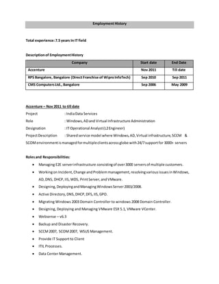Naveen Naik is a highly qualified IT professional with over 7 years of experience in Windows, Active Directory, SCCM, SCOM, and virtual infrastructure administration. He has expertise in managing Windows 2003 and 2008 servers, Active Directory, DNS, DHCP, GPOs, SCCM installation and configuration, and VMware. Currently working as an IT Operational Analyst, his responsibilities include managing infrastructure for over 3000 servers, resolving issues, migrating servers, and providing 24/7 support. He has experience working on projects involving Active Directory implementation, Exchange migration, SCCM implementation, and software distribution.