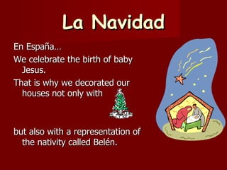 In Spain, Christmas is celebrated with family gatherings, special meals, religious traditions, and gift giving associated with the Three Wise Men rather than Santa Claus. On Christmas Eve (Nochebuena), families have a big dinner together and some go to midnight mass. Children receive their gifts on January 6th, which is when the Three Wise Men are believed to have visited baby Jesus, rather than on December 25th. New Year's Eve is also a time for celebration with meals, parties, and eating 12 grapes at midnight for good luck in the new year.