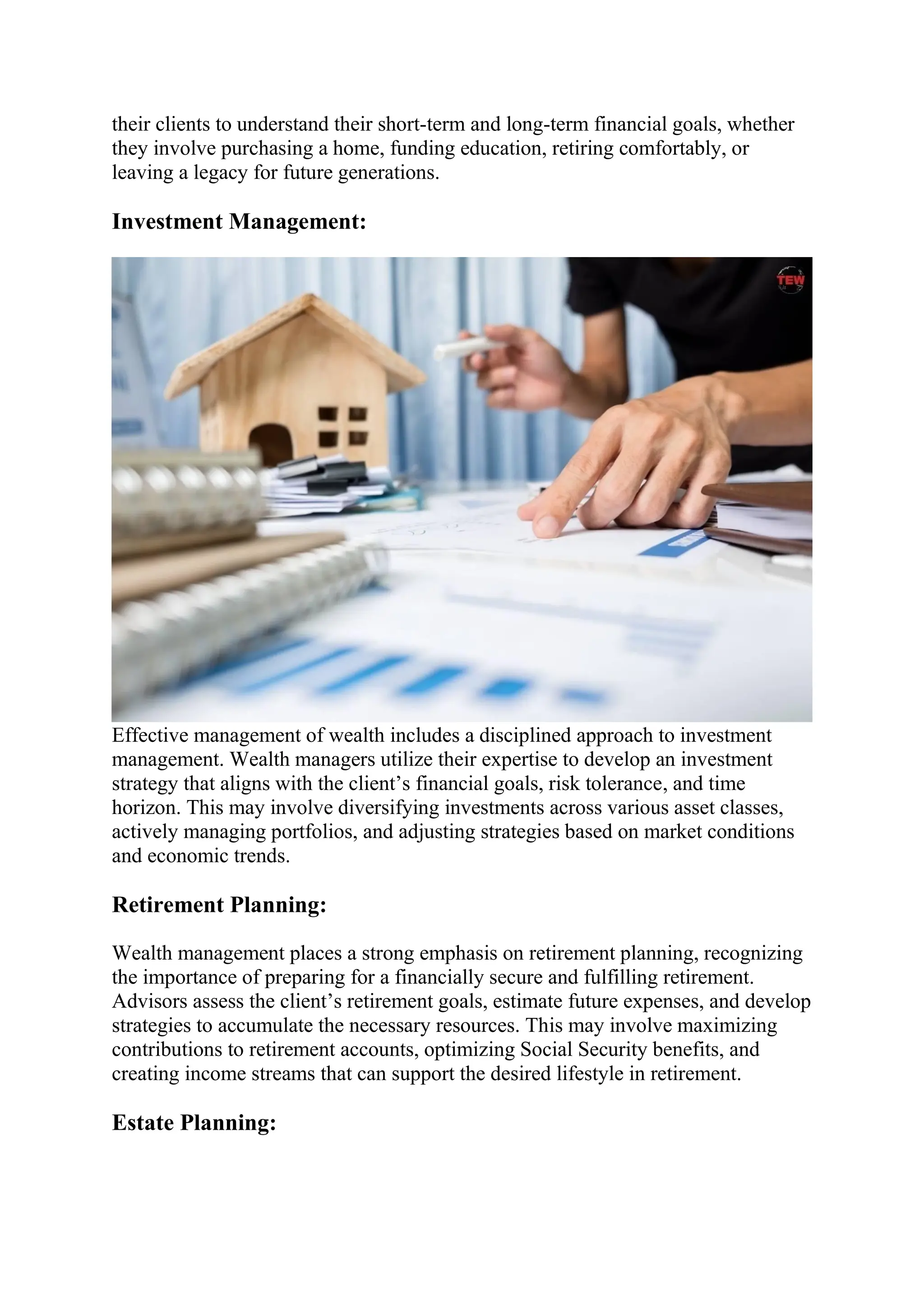 Wealth management has evolved to cater to individuals of various income levels, providing a comprehensive advisory process that includes financial planning, investment management, and estate planning. It emphasizes personalized solutions, risk management, and tax strategies to help clients achieve their financial goals while adapting to changes in the market and client needs. The role of technology and behavioral finance in wealth management is increasingly significant, ensuring clients navigate financial complexities effectively.