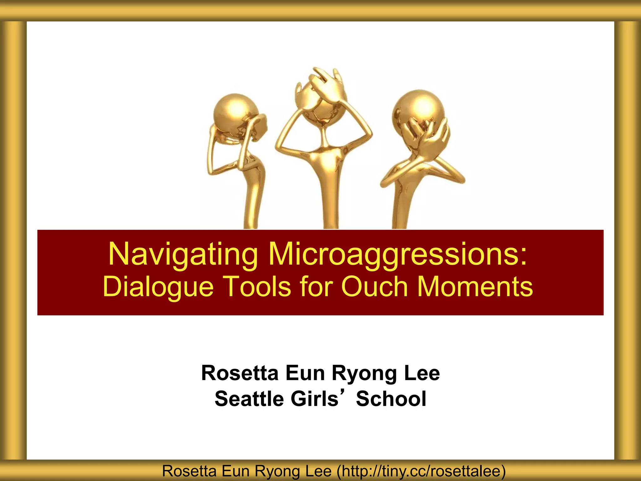 The document by Rosetta Eun Ryong Lee discusses navigating microaggressions and provides dialogue tools for addressing 'ouch moments' in personal and educational contexts. It emphasizes the importance of affirming relationships, using 'I' statements, and prioritizing emotional impact over intent when addressing or witnessing microaggressions. Additionally, it encourages strategies for active listening, self-reflection, and fostering inclusive communities while emphasizing the necessity of vulnerability and grace in these conversations.