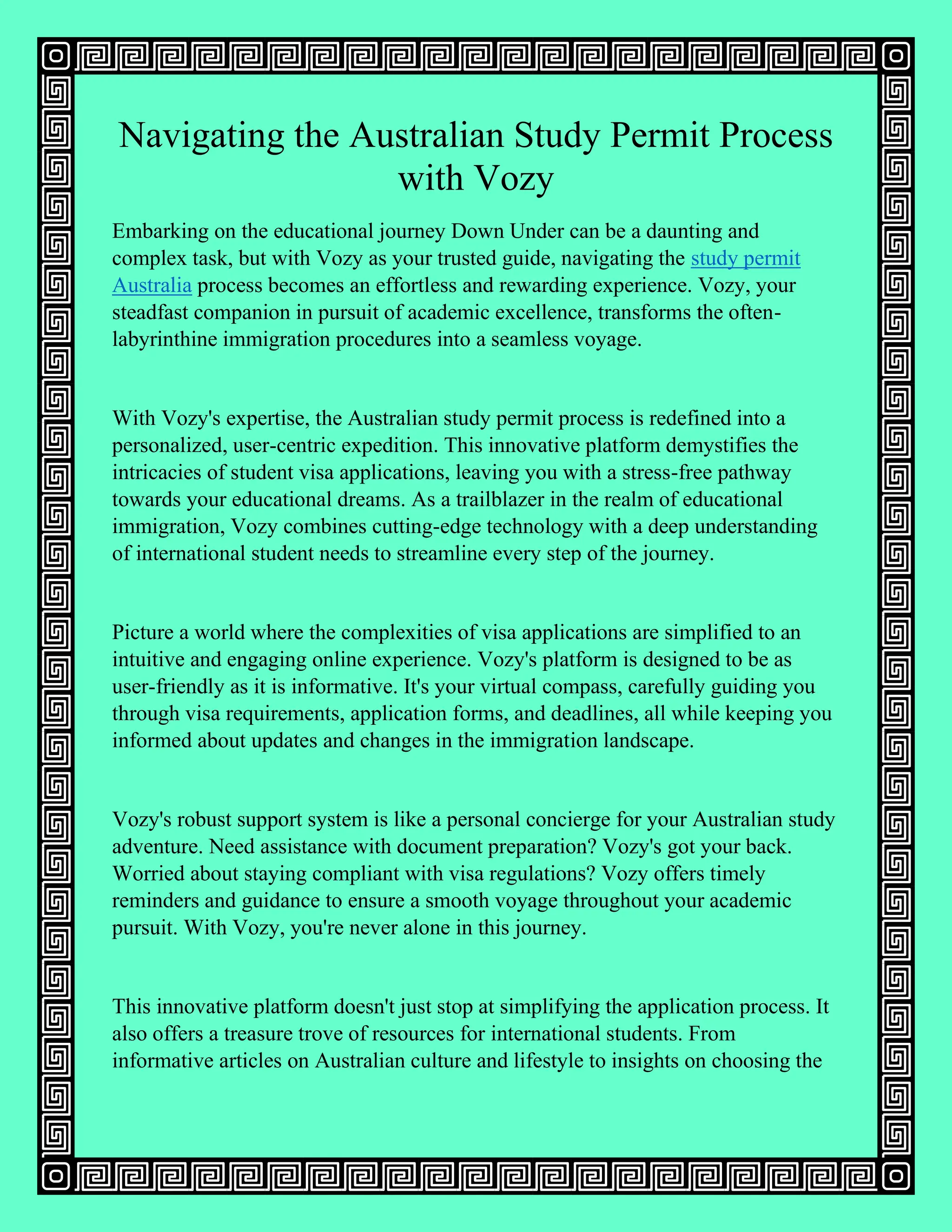 Navigating the Study Permit Australia Process with Vozycis more than just a process; it's a transformative experience. It's a digital guide, a loyal companion, and an expert advisor all rolled into one. Vozy doesn't just help you secure a study permit; it paves the way for a brighter, more informed future in Australia. So, set sail with Vozy on your side and embark on a seamless, worry-free educational journey in the Land Down Under.