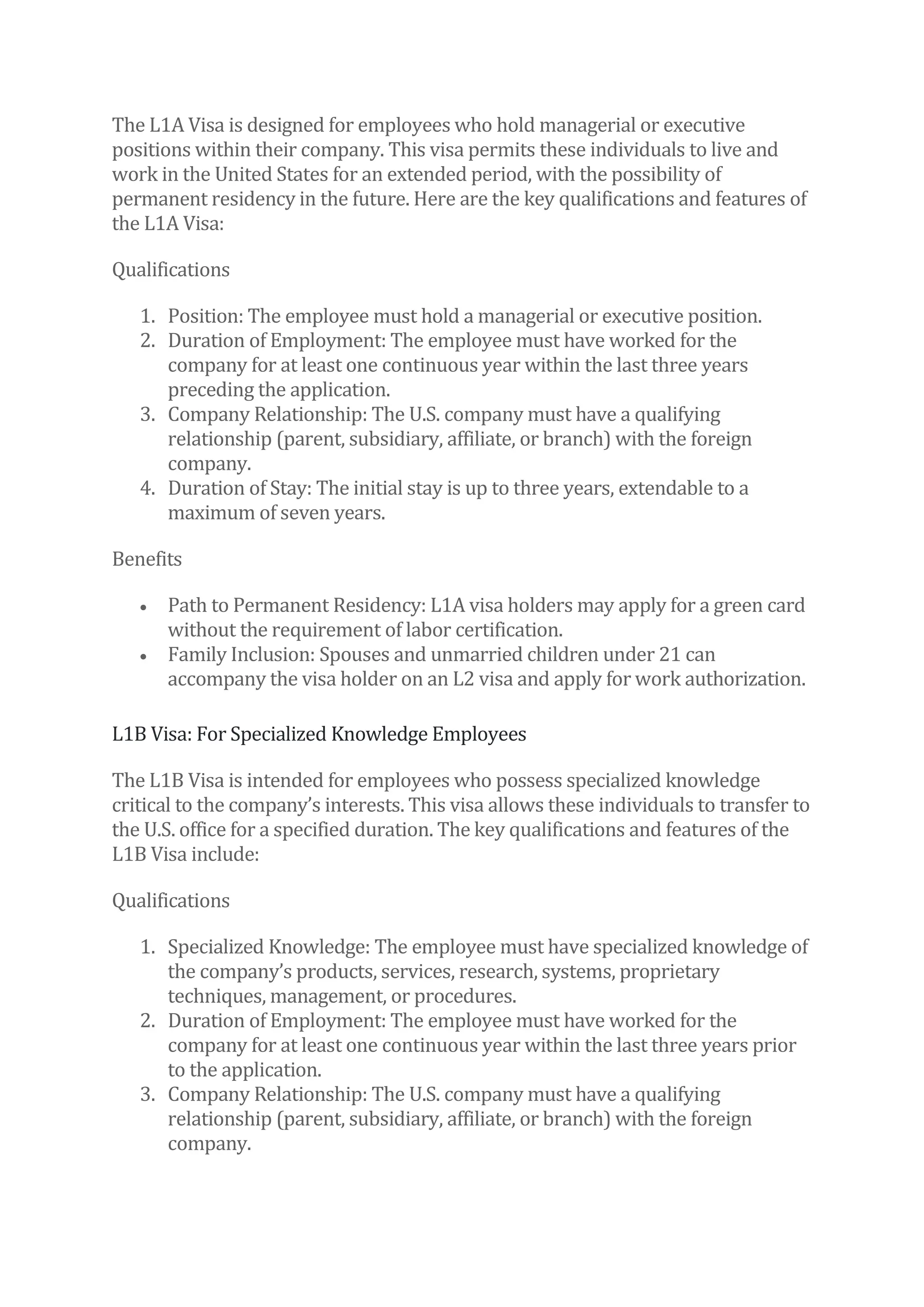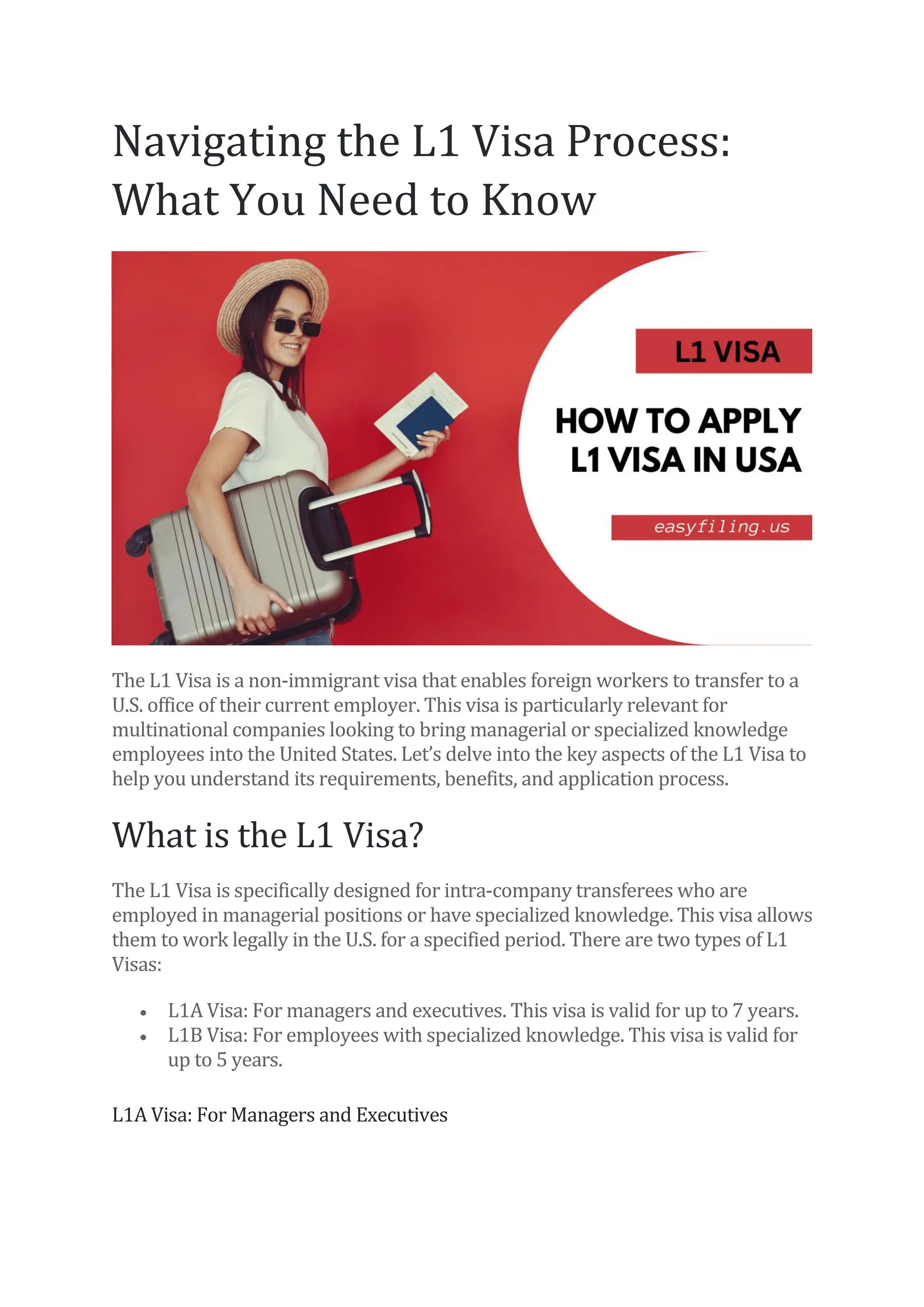 The L1 visa is a non-immigrant visa that allows foreign workers in managerial or specialized knowledge roles to transfer to a U.S. office of their employer, with two main types: L1A for managers (valid for up to 7 years) and L1B for employees with specialized knowledge (valid for up to 5 years). Key benefits include a pathway to permanent residency, familial inclusion, and no annual caps on visas issued. The application process involves proving the qualifying relationship between the U.S. and foreign companies, and there are specific documentation requirements for both employers and employees.