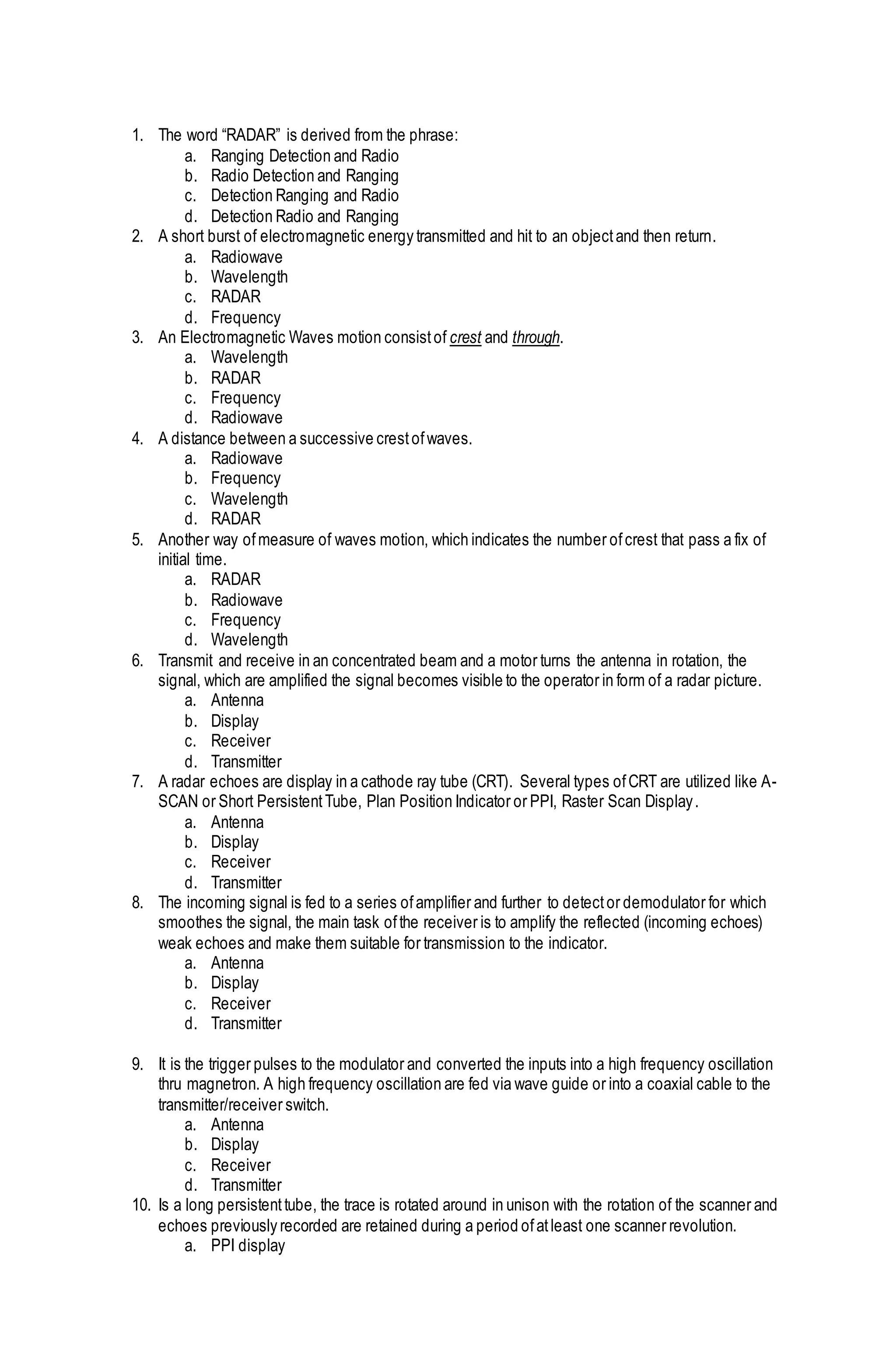 The document discusses key concepts and components related to radar systems. It defines common radar terminology like RADAR, wavelength, frequency, and pulse. It describes how radar works by transmitting electromagnetic pulses and receiving echoes. The main components of a radar system are identified as the transmitter, antenna, receiver and display. The document explains different types of displays like PPI and factors that affect radar performance such as sea clutter, ducting, and blackouts. It also covers topics like radar reflectors, radar beacons, and symbols used to control a radar system.