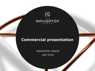 The Navigator Company is a leading producer of paper and tissue products in Europe. It has recently expanded into the tissue business with an acquisition and investment in a mill in Portugal. The document discusses Navigator Tissue's focus on quality, innovation, competitiveness, and sustainability. It provides details on Navigator Tissue's modern equipment and technologies, vertically integrated pulp supply, and environmental commitments. The brands and product lines for both consumer and professional tissue segments are also outlined.
